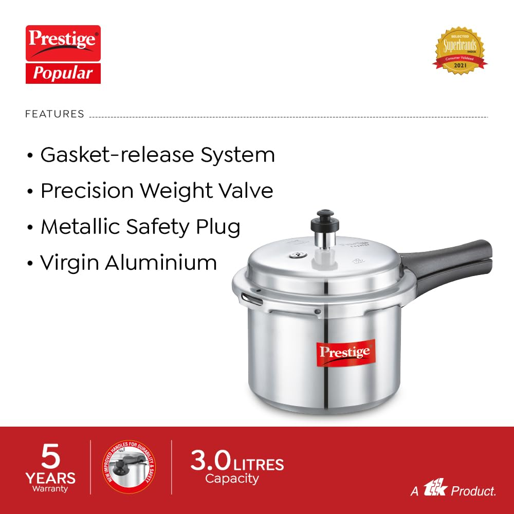 Prestige Popular Pressure Cooker – 3‑litre, 1.2 mm incl. induction base. Strong build, reliable brand, ~₹1,470. Ideal for daily Indian meals.