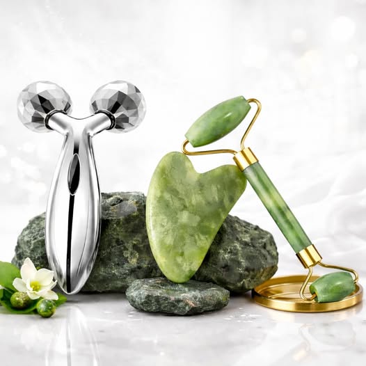 A calming skincare moment with a natural jade stone that gently glides over the skin to reduce puffiness, boost circulation, and reveal a brighter, smoother complexion—perfect for daily self-care and radiant beauty.