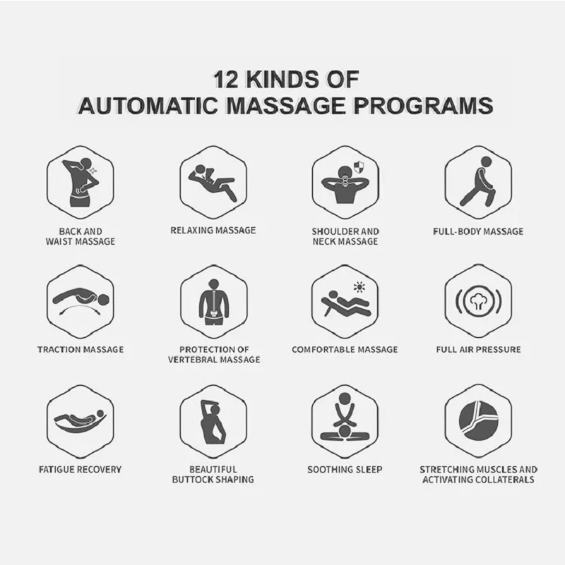 It has 9 massage programs with Full control of all parts like Air Pump Areas, All Shape of massage, Volume control of each part, independent massage control with right, left, up and down buttons and selection of the type of massage.