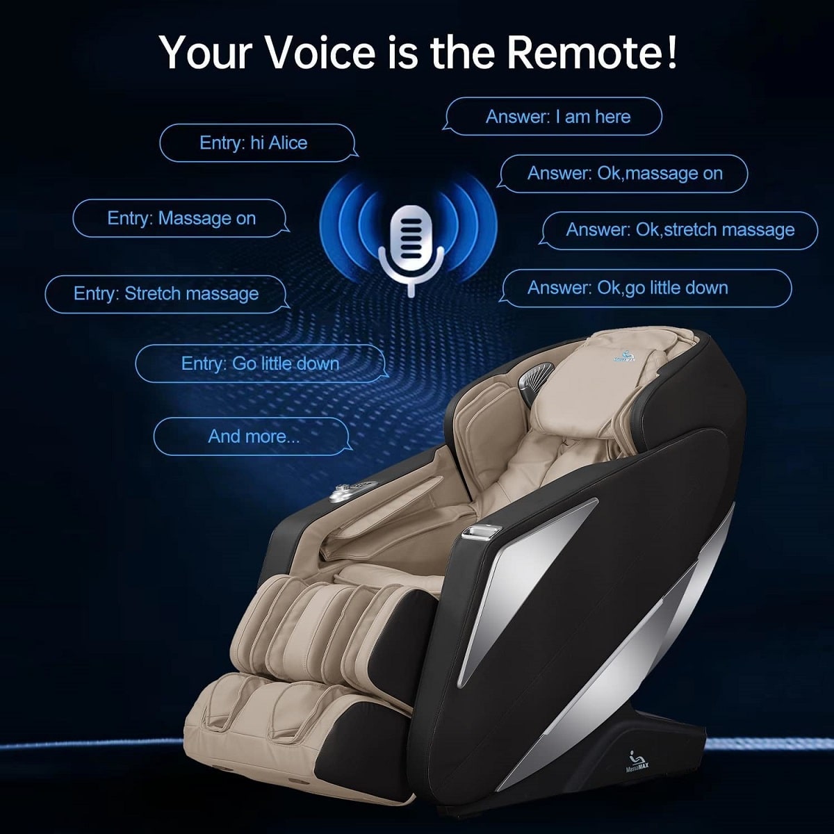 Your Voice is the Remote! Built with Intelligent Voice Control function, you can easy control your massage by simply telling the Hi Alex massage chair your program selection.