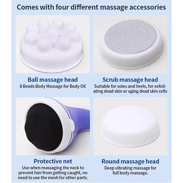 This massager comes with four specialized attachments to customize your experience. Use the ball head for oil massage and deep stimulation, the scrub head to exfoliate soles and remove dead skin, the round head for full-body vibration, and the protective net for safe neck massage. One device—endless ways to relax, refresh, and rejuvenate.